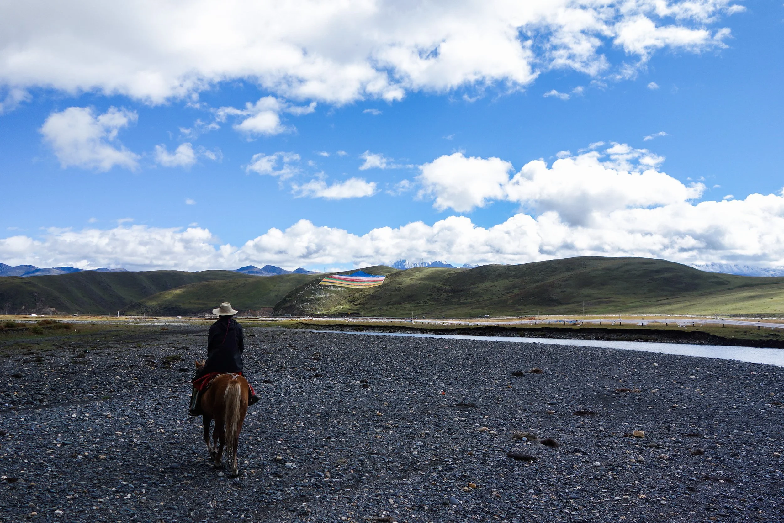 Nous partageons un transfert pour Tagong avec deux autres voyageuses et en moins de deux heures, nous atterrissons dans un autre monde. Nous sommes passés devant le second plus haut aéroport du monde, avons serpenté le long d’une route magnifique et avons croisé plusieurs fourgons blindés de militaires. Bienvenue en zone tibétaine. Les gens apparaissent différents, s’habillent différemment, parlent un autre dialecte, mangent différemment, ont une autre religion… C’est l’endroit parfait pour avoir un avant-goût du Tibet et de sa culture. Tagong est une petite ville très tranquille et froide, où il ne se passe pas grand chose. Il pleut ce jour-là et l’endroit a des airs de ville fantôme. Les vaches, chiens et cochons se promènent tranquillement et les quelques personnes que nous croisons sont très amicales. Nous atterrissons dans la Guesthouse d’Angela, une américaine qui tient ce centre nomade qui fait aussi café et boutique. Malheureusement, il n’existe plus aujourd’hui, mais devrait ouvrir un nouveau centre dans les plateaux. Il est toujours possible d’organiser des treks à cheval au Tibet avec eux.