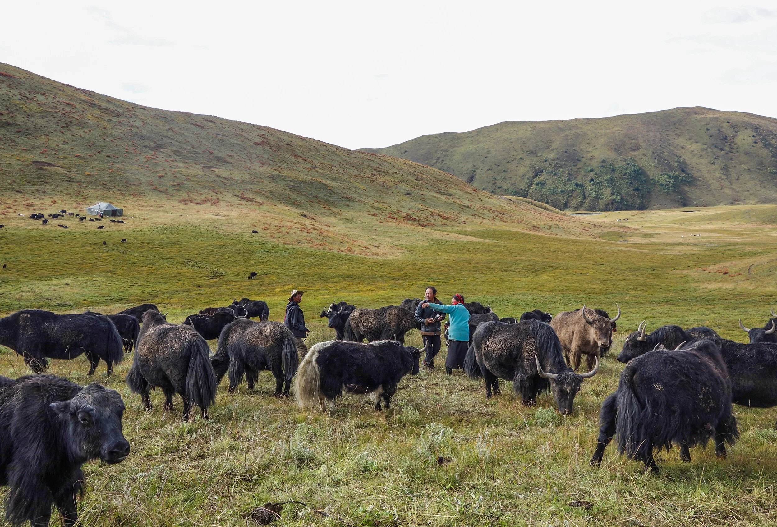 Les paysages que nous traversons sont splendides et aucune photo ne leur feront justice. Nous sommes absolument seuls au monde et nous avançons tranquillement, en écoutant le silence. Je souris comme une gosse, je me sens libre, en harmonie avec la nature, dans un autre monde, loin de tout. Nous nous connectons vraiment avec le mode nomade, nous comprenons la distance qui nous sépare d’eux. J’ai beau être nomade, mon mode de vie n’a rien à voir avec le leur. Une dernière descente et nous arrivons au campement, la tente de notre guide. Sa femme est là à nouveau et l’on se demande bien comment elle est arrivée avant nous. À dos de yak peut-être? Autour de la tente, des paysages sublimes et toute une colonie de yaks, plus ou moins patibulaires. On observe la traite, on tente des selfies avec eux et l’on profite du calme du lieu. C’est l’heure du dîner et nous savourons des dumplings au fromage de yak et aux légumes. Miam, miam, qui aurait dit que nous mangerions si bien! 20h, il fait nuit et il est temps de dormir. La journée a été fatigante et le sommeil ne se fait pas attendre. Sauf qu’il pleut, qu’il fait un froid de canard malgré les 10 couvertures et que 15 bébés yak dorment avec nous… sous la tente: L’effet du thé et du froid se font sentir et je dois retenir mon envie toute la nuit: pas question de sortir et de me faire encorner par un yak dans la nuit! Le jour se lève et il est temps de repartir. Je n’ai pas vraiment les yeux en face des trous, mais heureusement, ce n’est pas moi qui doit marcher.